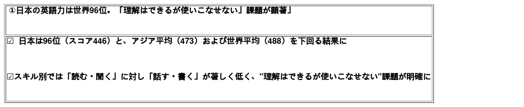 「日本人の国別英語力ランキング」は、世界96位、"話す・書く力"が主要課題。