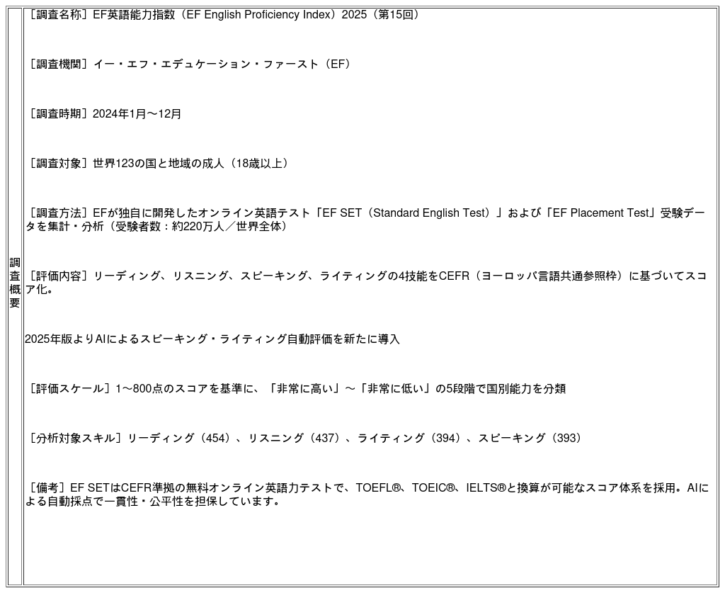 2011年の初回調査から毎年実施、世界最大規模の英語能力比較調査として知られており、今回はAIによるスピーキング・ライティング自動評価を初導入しています。