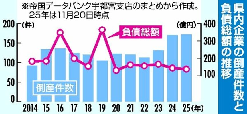 物価や人件費の上昇など企業経営を取り巻く環境が厳しくなる中、栃木県内で中小企業・小規模事業者の倒産が増加している。帝国データバンク宇都宮支店の2025年のまとめによると、20日時点の倒産件数は172件で24年1年間の170件を上回り、2年連続で過去最多を更新した。東京商工リサーチ宇都宮支店の調べでも同日時点で164件となり、11年以降で最多となっている。コスト増で思うように利益を確保できず、事業を断念する事例が相次いでいる。