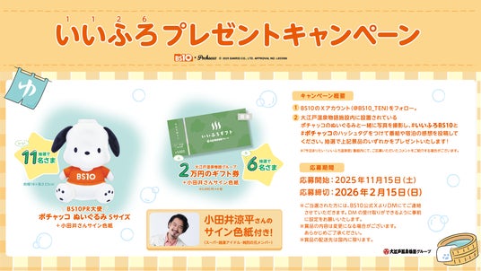 「今泊まりたい!いいふろ温泉宿」と、すべての世代の方に親しみやすい温泉宿を目指し「温泉」「バイキング」「おもてなし」の3つのこだわりをもって全国で温泉宿を展開する「大江戸温泉物語」とのコラボ企画「BS10×大江戸温泉物語Presentsいいふろプレゼントキャンペーン」が11月15日(土)から開催中。番組に出演する小田井涼平さん(スーパー銭湯アイドル・純烈の元メンバー)サイン色紙付きの豪華なグッズが抽選で当たるSNSキャンペーンとなりますので、どうぞ皆さま奮ってご参加ください!