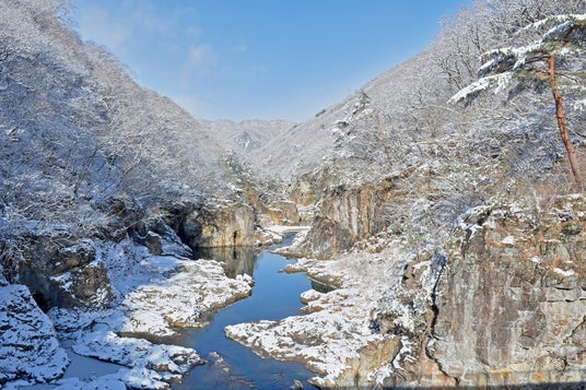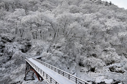 夏の新緑や秋の紅葉も有名ですが、冬に雪が積もると雪が周囲の音を吸い、耳鳴りがするほどの静けさに。雪に包まれた白銀の渓谷が生み出す、幻想的な雪景色を堪能できます。自然散策路途中の虹見橋は特におすすめのビュースポット。散策で身体が冷えた時は、駅前の飲食店で温かい軽食をとり、一息つくのがおすすめです。