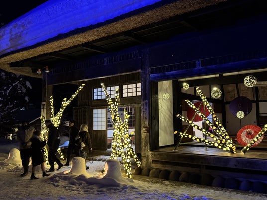 雪に包まれた茅葺屋根の古民家集落に、大小さまざま“かまくら”が灯る幻想的な夜。冠雪の中、柔らかな光が平家の里を包み込み、どこか懐かしい、あたたかな雰囲気で人々を出迎えます。
