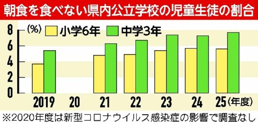栃木県内公立学校の児童生徒で朝食を食べていない割合が、小学6年生で5・6%、中学3年生で7・7%だったことが22日までに、文部科学省の「2025年度全国学力・学習状況調査」で分かった。6年前に比べそれぞれ1・9ポイント、2・3ポイント増加しており、0%を目指す県教委の目標と乖離(かいり)している。朝食欠食は集中力や記憶力の低下などにつながるとされ、県教委は家庭と連携した生活指導を実施したい考えだ。