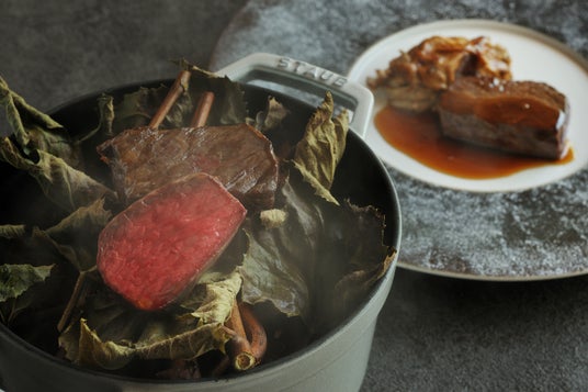 スカルモッツァアフカミータというイタリアの燻製したチーズを白身魚で挟み、焼き上げました。蕪や蕪の葉と共に仕立てたリゾットは施設内の田んぼで収穫した「アグリガーデン米」を使用。リゾットの上にはアマランサス、シブレット、レッドソレルなどを使用したハーブサラダをのせ、それぞれの風味を楽しめます。赤ワインベースのテガマッチョスープ(*4)が白身魚の旨みを引き立て、最後にかけるミントオイルの爽やかな香りで仕上げています。