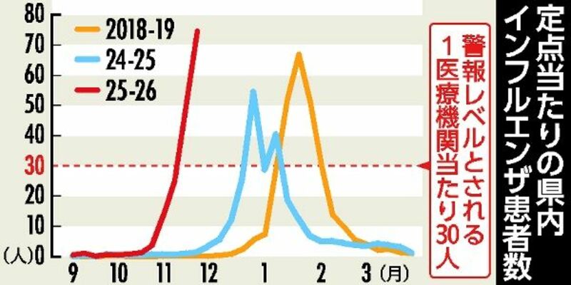 栃木県保健福祉部は27日、県内の1医療機関当たりのインフルエンザ患者数(17~23日)が74・47人だったと発表した。県内全域の患者数が警報レベル(30人)を超えた前週(49・60人)の1・5倍となり、統計が残る1999年以降で最多となった。患者の8割以上を19歳以下が占め、専門家は子どものワクチン接種が終わっていないことや、対策への意識低下が感染急拡大の一因と指摘。県は「今まで以上の警戒が必要」と注意を呼びかけている。