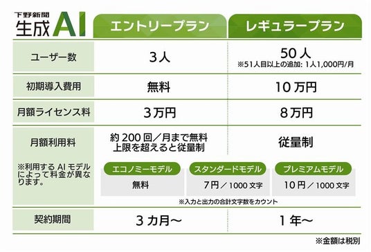 株式会社下野新聞社(本社:栃木県宇都宮市昭和/代表取締役社長:若菜英晴)は、栃木県内の豊富な地域情報に基づく生成AIサービス「下野新聞生成AI(以下、下野AI)」の提供を開始しました。月額3万円から導入でき、過去15年分の下野新聞記事データと法人向け国内シェア1位の「エクサベース生成AI」を連携。安全・簡単・地域に特化したAI活用で、人手不足の解消と業務効率化を力強く後押しします。