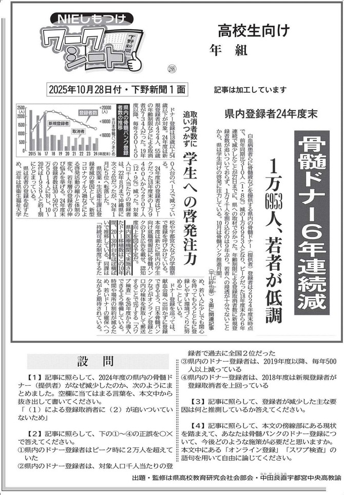下野新聞の記事を使って社会への関心や読解力を高める「ワークシート」をスタートします。出題するのは、県小・中・高校教育研究会の国語・社会部会に所属する教員たち。ぜひ挑戦してください。