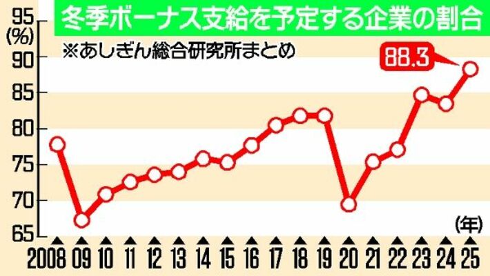 あしぎん総合研究所は9日までに、2025年度に冬季ボーナスを「支給予定」とした企業の割合は前年度比4・8ポイント増の88・3%で、08年度の調査開始以降で最高になるとの予測調査結果を発表した。同総研は「厳しい収益環境が続いているが、人材のつなぎ留めを目的にボーナスを支給する企業が増えている」とみている。