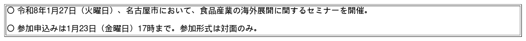 農林水産省は、令和8年1月27日(火曜日)、東海農政局において食品関連企業の海外展開に関するセミナー(主催:グローバル・フードバリューチェーン(GFVC)推進官民協議会)を開催します。