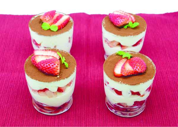⑤ 仕上げにココアを振りかけて飾り用のイチゴをのせてお好みでミントの葉を飾る。