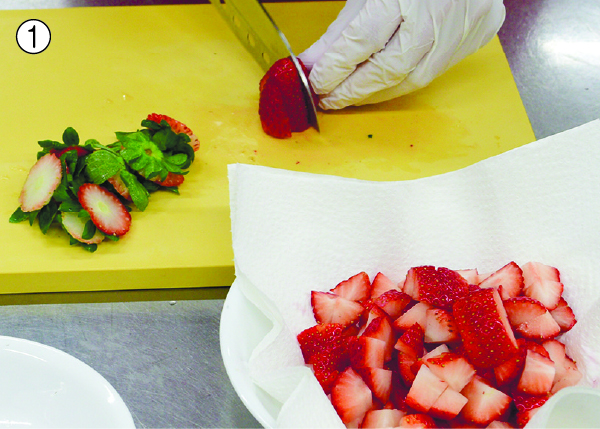 ① イチゴは洗って水気を拭き取り、ヘタを切り落として1cmの角切りにする。※飾り用のイチゴは薄くスライスする。