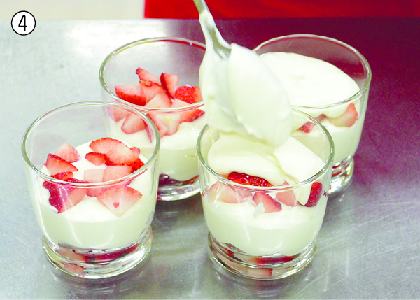 ④ 器に①を敷き詰め、③を入れる。これをもう一度繰り返し、表面をスプーンを使ってきれいに整える。※合計4個作る。