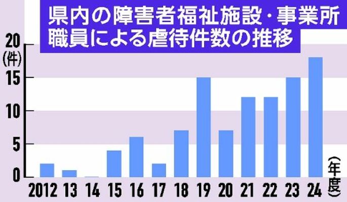 2024年度の県内障害者福祉施設・事業所の職員による障害者虐待は前年度比3件増の18件、介護施設職員による高齢者虐待は1件増の14件となり、いずれも調査開始以降最多を更新したことが24日、県保健福祉部のまとめで分かった。虐待防止の職員研修の義務付けなどで、通報の意識が浸透したことが背景にあるとみられる。