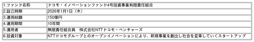 株式会社NTTドコモ(以下、ドコモ)と株式会社NTTドコモ・ベンチャーズ(以下、NDV)はNTTファイナンス株式会社と共に、有望なサービスや技術をもつスタートアップとの連携強化を目的とした、運用総額150億円の「ドコモ・イノベーションファンド4号投資事業有限責任組合(以下、DI4号ファンド)」を、2026年1月1日(木)に新たに設立いたします。