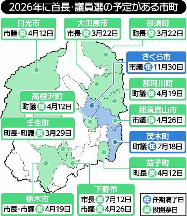 栃木県内では2026年、任期満了に伴い3市4町の首長選が予定されている。人口減少に歯止めがかからず各市町にとって地方創生が最重要課題となる中、今後のかじ取り役を誰が担うかが注目される。国政選挙では衆院選の有無が最大の焦点だ。高い支持率を背景に高市早苗(たかいちさなえ)首相が解散・総選挙に打って出るのか。挑む野党は警戒感を強め、迎え打つ与党も準備に余念がない。