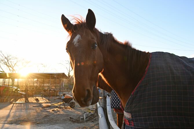 冬のりんとした空気が漂う午前7時ごろ。筑波山の方角から朝日が昇り始めると、スタッフが厩舎(きゅうしゃ)から約15頭の馬を馬場へ放った。馬たちは白い息を吐きながら、たてがみを揺らして伸び伸びと体を動かしていた。