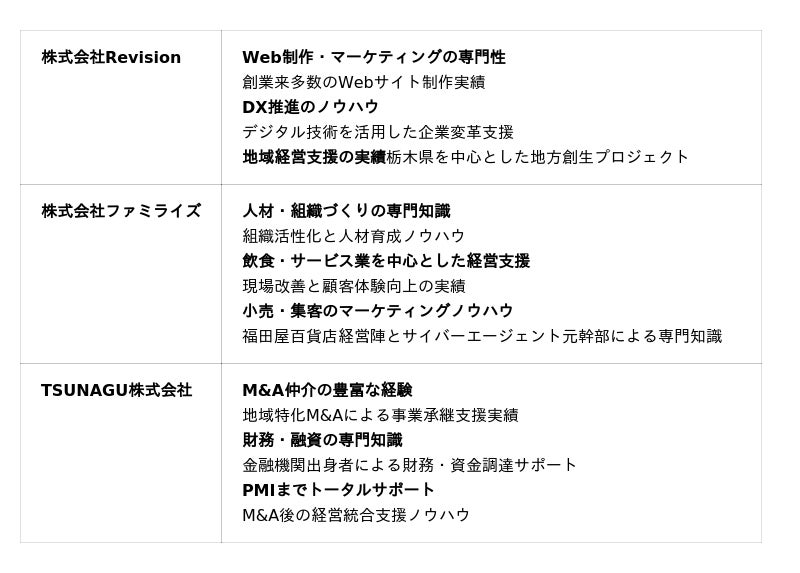 30代の経営者3名がそれぞれの専門性を持ち寄り、単発の施策ではなく、承継から再成長までを一気通貫で支援することを目的としています。