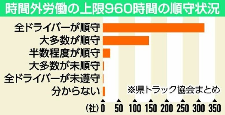 トラック運転手の労働時間が規制され、物流の停滞が懸念された「2024年問題」を巡り、年間960時間に規制された運転手の時間外労働について、県トラック協会が実施した初の実態調査で、県内の運送事業者の6割超が「全ドライバーが順守できた」と回答したことが6日までに分かった。一方、一部で未順守の企業がある現状が浮き彫りになった他、輸送コスト増や運転手の採用難などの影響を訴える回答もあった。