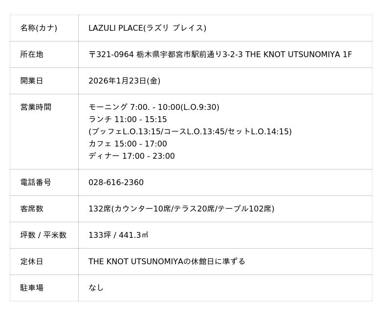 株式会社グリップセカンド(本社:東京都豊島区、代表取締役:金子信也)は、初のホテル内レストランへの取り組みとして、ライフスタイルホテル「THE KNOT UTSUNOMIYA」1Fにオールデイレストラン「LAZULI PLACE」とベーカリー「LAZULI BAKERY」を、2026年1月23日(金)に同時オープンいたします。