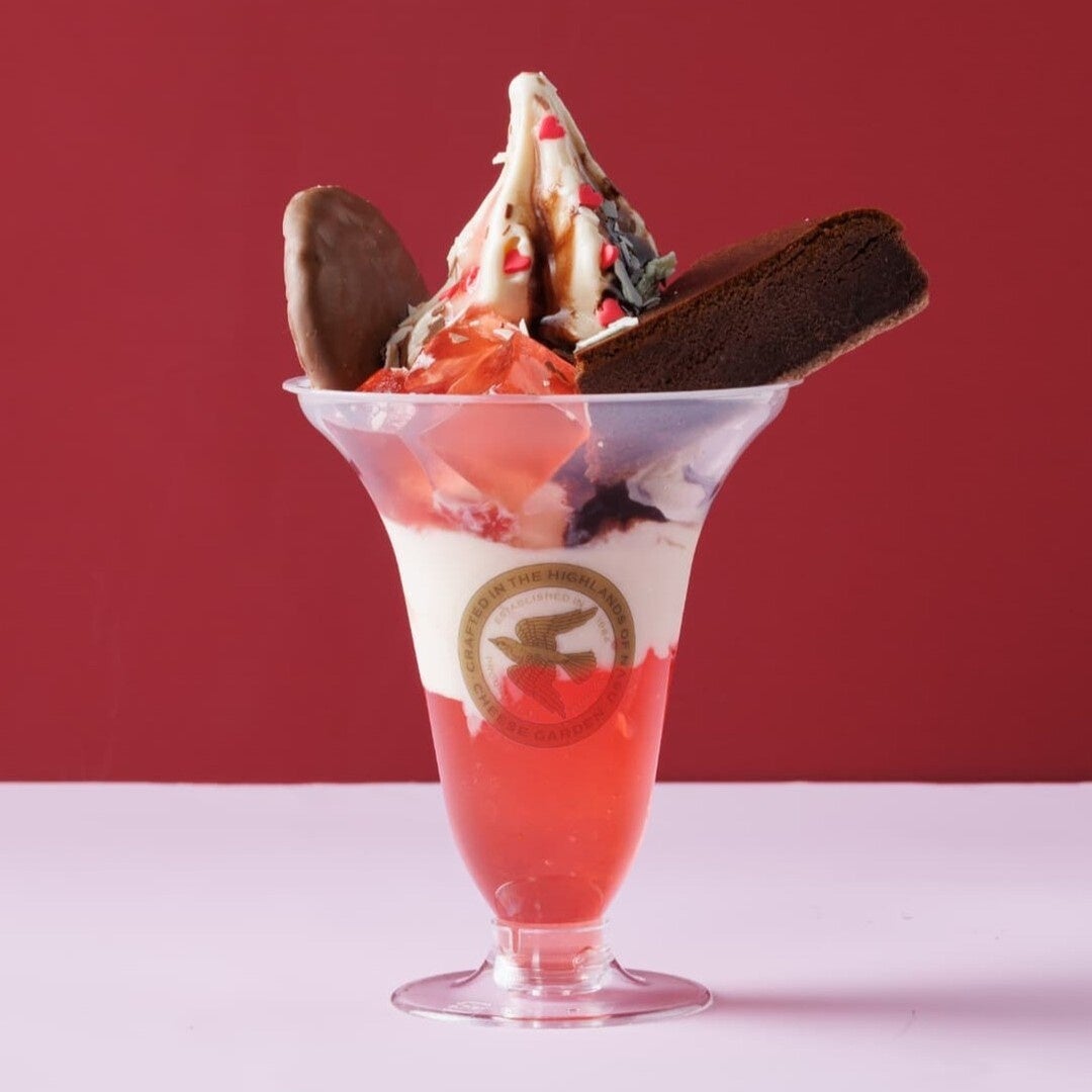 バレンタインシーズン限定販売の『バレンタインパフェ ストロベリー&ショコラ』は、甘い香りと味わいの栃木県産「とちあいか」を使用した苺ゼリーに、ベイクドチーズケーキ風味のチーズケーキソフトを重ねました。上には「御用邸ショコラチーズケーキ」と「御用邸ミルクショコラチーズクッキー」をのせ、苺ゼリーをトッピングして、チョコレートソースとストロベリーソースをかけ、2種類のチョコレートコポー※(ホワイト・ミルク)、赤いハート型のトッピングシュガーで彩りました。