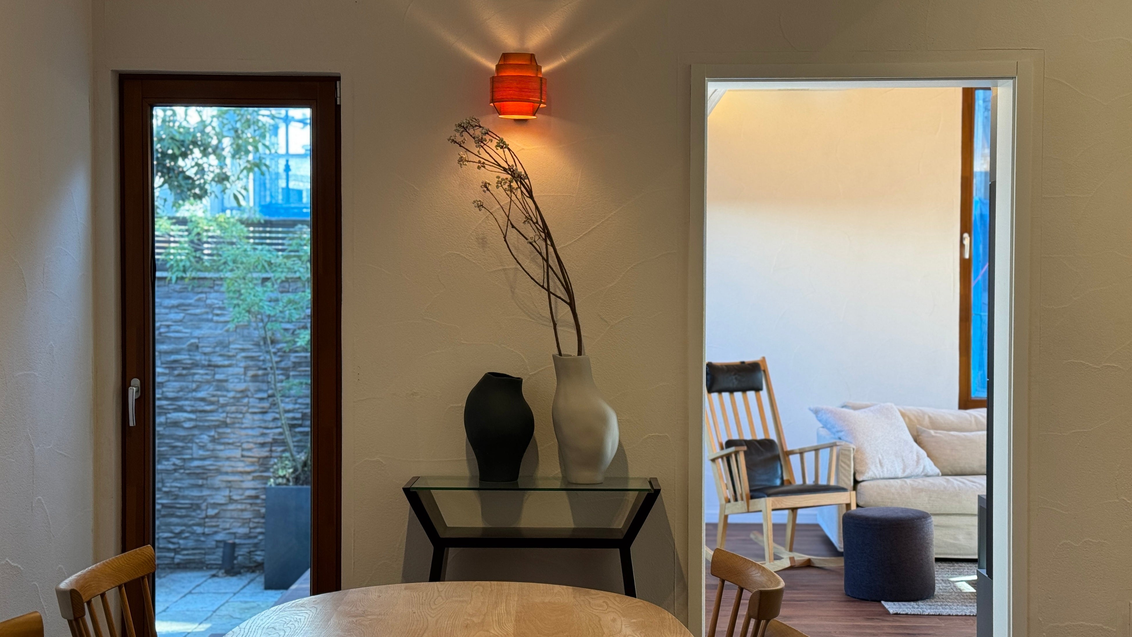 1階床材には重厚感と上質さを演出するウォールナットの三層フロアを敷き、建具はフラット仕様に変更。モダンなデザインに統一しました。さらに、壁面には室温変化を緩やかにする蓄熱塗り壁「エコナウォール」を広く用いることで、空間全体の質感と快適性を高めています。