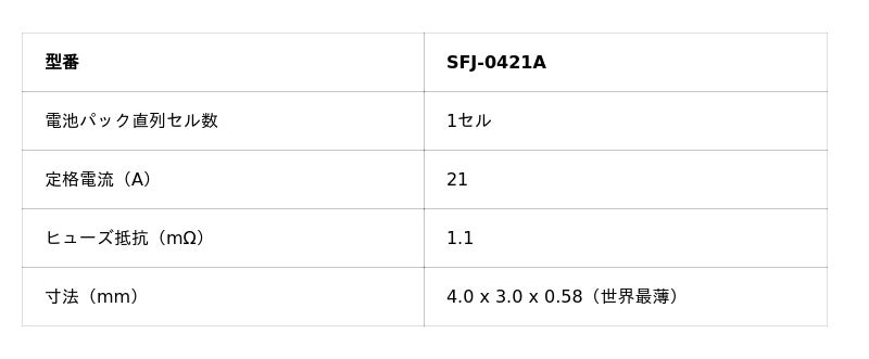 デクセリアルズ株式会社(本社:栃木県下野市、代表取締役社長:新家 由久、以下、当社)は、このたび、リチウムイオンバッテリーの二次保護のための表面実装型ヒューズとして世界最薄※1となる、厚み0.58mmを実現した「SFJ-21A」シリーズ(SFJ-0421A)を開発、製品化したことをお知らせします。