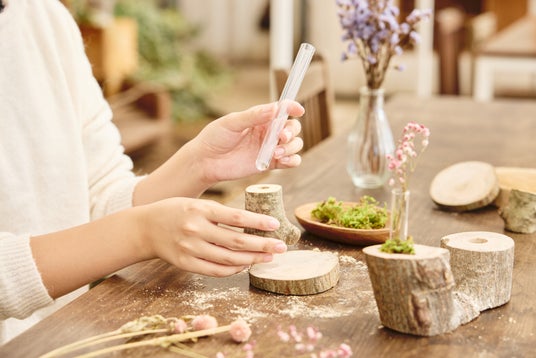 農園「アグリガーデン」では、知的好奇心をくすぐるフラワースタンドづくりを開催します。施設内では、健全な森林を維持するために定期的に間伐を行っています。間伐によって生まれた木材を使用するため、木材の色や形、サイズも様々。自分好みの木材を選び、穴を開けたり削ったりして形作ることで思い思いのスタンドができあがります。最後に、お気に入りのドライフラワーをガラス瓶に通すと、自分だけのオリジナルフラワースタンドが完成します。