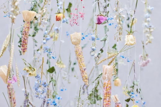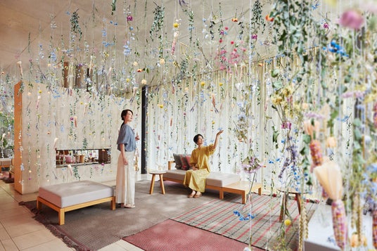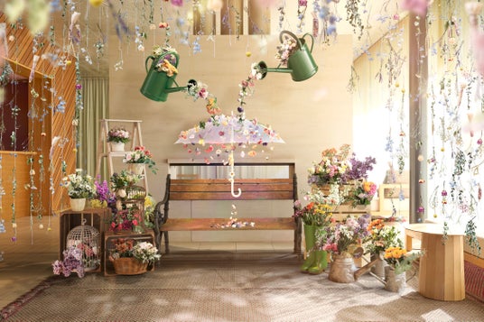イベント期間中、レセプションにバラやユーカリ、トウモロコシなどを組み合わせた装飾を施し、360度花やハーブ、野菜に包まれるような空間を演出。花やハーブを1本の糸で連なるようにくくり、天井から吊り下げて装飾します。また、今年は花のシャワーを浴びているかのようなフォトスポットがレセプションに初登場。ソファに座って見上げてみたり、フラワーシャワーに入ったりと一味違うお花見を満喫できます。