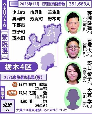 10期約30年務めた自民党の佐藤勉(さとうつとむ)元総務相の引退に伴い、構図が激変する。中道改革連合前職藤岡隆雄(ふじおかたかお)氏(48)に、佐藤氏の後継で自民党新人の石坂太(いしざかまさる)氏(45)のほか、参政党と無所属の新人が挑む。