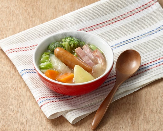 ごろごろ野菜のポトフ新鮮な丸鶏と鶏がらをふんだんに使用し、じっくり炊き上げたコク深いチキンブイヨンが自慢のポトフです。パリッとジューシーなポークソーセージとベーコンに、ゴロッとした人参やじゃが芋、食べ応えのあるキャベツなどを合わせました。