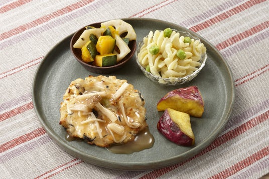豆腐ハンバーグ(ワタミファームの有機きく芋入り) 他ワタミオリジナルで配合した豆腐ハンバーグです。木綿豆腐に国産鶏むね肉の粗びきミンチ、ひじき、人参、枝豆とワタミファームの有機きく芋パウダーを混ぜ込みました。ひとつずつ手で丁寧に形を整え、オーブンで焼き上げています。かつおだしの効いた和風きのこあんで優しい風味に仕上げました。ヘルシーながら食べ応えのある一品です。