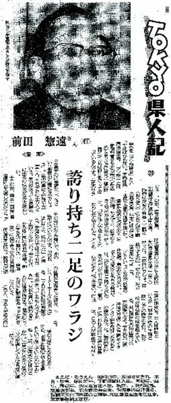 1991年、1面掲載の「TOKYO県人記」で取り上げていただきました。東京で活躍する本県出身者を紹介する連載。森昌子(もりまさこ)さん、ガッツ石松(いしまつ)さんなどキラ星のごとき著名人が登場する中、私も本記事掲載により、一躍“時の人”になりました。