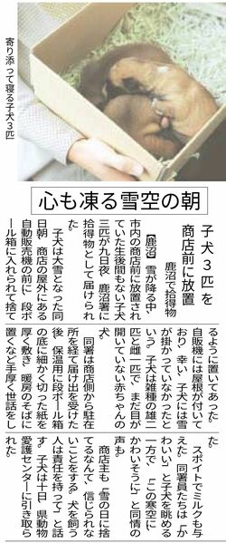 まだ目も開いていない子犬3匹が、空き箱の中で折り重なるようにしている写真が掲載されました。雪の日だというのに…。