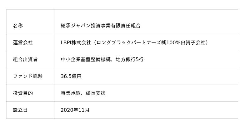 継承ジャパンファンドは、独立行政法人中小企業基盤整備機構様や地域金融機関様から出資を受けて設立され、地域の核となる中小企業への投資を通じて事業承継を支援し、日本各地で地域経済を支えている優れた事業を発展、成長させることを目指していくファンドです。