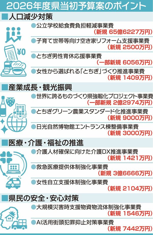 福田富一(ふくだとみかず)知事は6日、2026年度県当初予算案を発表した。一般会計は前年度当初比364億8千万円(3・9%)増の9606億8千万円で、5年ぶりに増加へ転じた。高齢化の進行による医療福祉関係経費などの義務的経費や物価高騰への対応経費の増加などが理由で、総額は過去4番目の規模となった。人口減少対策や産業創出、教育環境の体制整備などに重点を置いた。