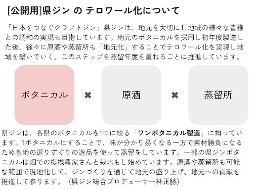 ご当地ならではの特産品をボタニカルに使用し、美味しさにこだわるのはもちろん、地域の魅力やお酒を片手に集まる場での楽しいコミュニケーションのツールとして”県人も、そうじゃない人もみんな、笑顔にしたい。”をモットーとして、「県ジン」をきっかけに、都道府県ごとの魅力の発信や地域活性化、生産者や販売者をつなぐネットワークづくりを行っていきます。