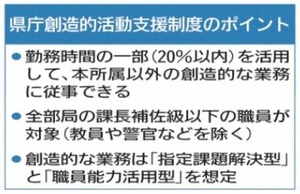 対象は課長補佐級以下の職員で、教員や警察官、会計年度任用職員を除く。勤務時間の20%以内で所属外の活動に従事できる。参加する場合は所属長に申請し、許可を得る。県によると、同様の制度は長野県や福井県で導入されているという。