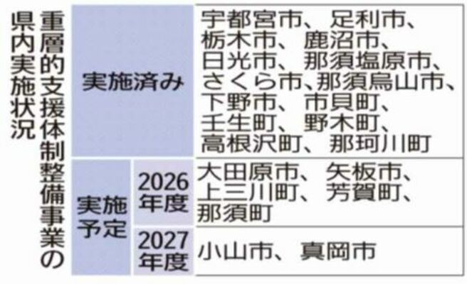 「重層事業」は2022年度に栃木、市貝、野木の3市町が先行して始め、25年度は14市町まで拡大した。26年度は5市町、27年度は2市が本格的に着手する予定だ。複雑化・複合化する福祉分野の課題に対応する相談窓口の整備、専門職や地域につなぐ支援などが進んでいる。