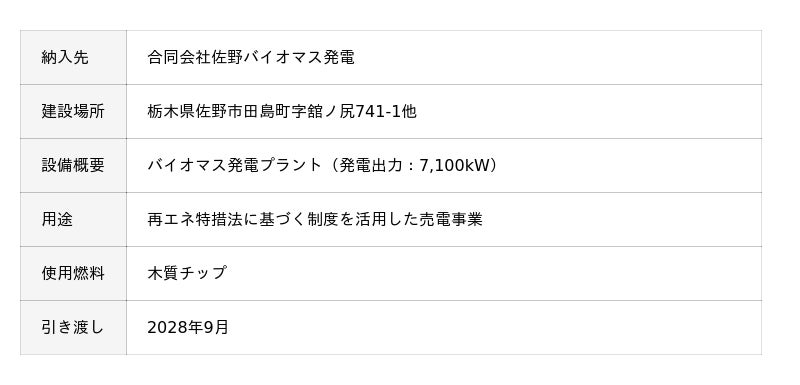 株式会社タクマ(本社:兵庫県尼崎市、社長:濱田州朗、以下「当社」)は、このほど、合同会社佐野バイオマス発電(所在地:群馬県館林市、代表職務執行者:黒田栄作)向けに、7MW級バイオマス発電プラント(以下「本プラント」)の建設工事を受注しました。