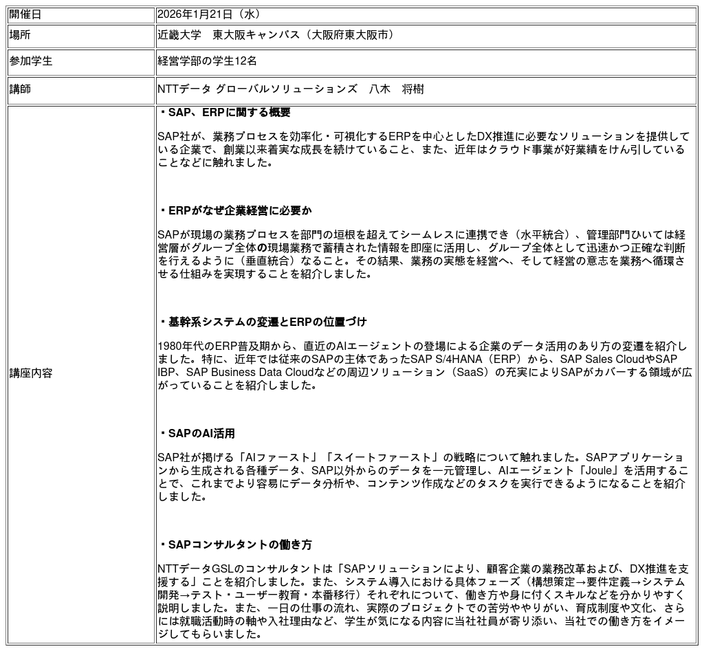 株式会社NTTデータ グローバルソリューションズ(本社:東京都中央区、代表取締役社長:木村 千彫、以下 NTTデータGSL)は、近畿大学経営学部(所在地:大阪府東大阪市、学部長:安酸 建二)の学生向けに、DX推進に必要な統合基幹業務システム(ERP)・SAPの基礎を紹介する講座を2026年1月に実施しました。