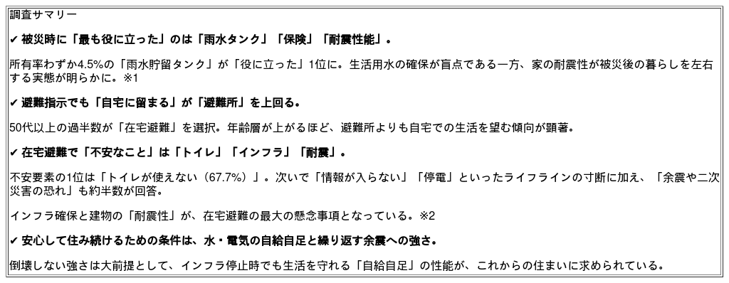 強さと広さを妥協なく追求した背景には、開発者が描く「住まい」への強い想いがありました。今回の調査結果を受け、開発者はこう締めくくります。