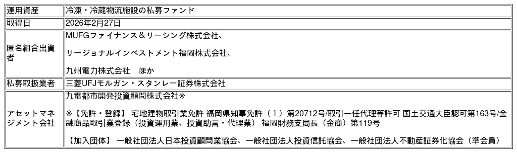九電グループによる環境配慮型物流施設を対象とする私募ファンドを組成 ― 不動産ファンド11号案件の組成とアセットマネジメント業務の受託 ―