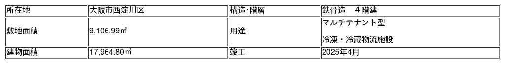 本件は、大阪市西淀川区内、阪神高速中島インターチェンジ至近の優れた立地にあり、京阪神圏をはじめ、関東・中国地方への広域配送拠点として高い利便性を備えた冷凍・冷蔵物流施設を対象としています。施設には、ノンフロン冷媒設備やLED照明など省エネ性を高める設備を備え、加えて九電みらいエナジー㈱が屋上に設置している太陽光発電設備の再生可能エネルギーを一部活用することで、CO₂排出量の低減に寄与する施設となっています。