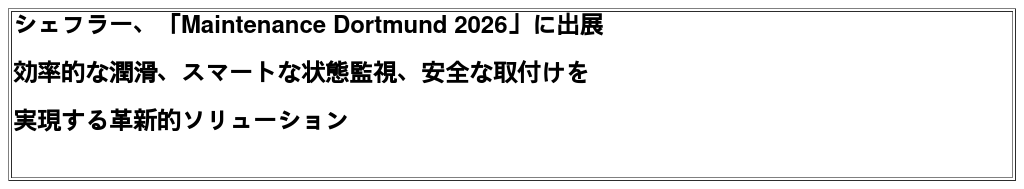 モーションテクノロジーカンパニーであるシェフラーは、ドイツ・ドルトムントで開催される産業用メンテナンスの主要展示会「Maintenance Dortmund 2026」に出展し、産業用メンテナンスプロセス、生産効率、そして設備の可用性を新たな次元へと引き上げる、革新的な技術とソリューションを披露します。