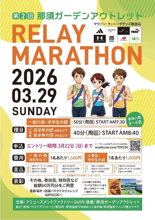 双日商業開発株式会社(東京都中央区 代表取締役 柏木広喜)が運営する「那須ガーデンアウトレット」(栃木県那須塩原市)で、2026年3月29日(日)に第2回那須ガーデンアウトレットリレーマラソンを後援いたします。