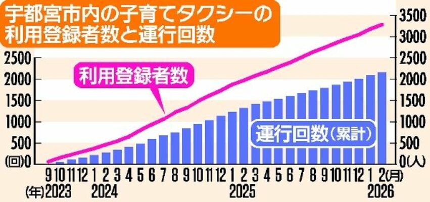 妊婦や子育て世帯の移動を支える「子育てタクシー」が宇都宮市内で急速に普及している。毎月約100人が新規に利用登録し、登録者数は昨年末に3千人を超えた。需要の高まりを受け、運行するタクシー会社も4月から4社が加わり6社体制へと拡大する。なぜ、市内でこのサービスが広がりを見せているのか。背景を探ると、宇都宮モデルとも言える利用者とタクシー事業者をつなぐ仲介事業者の存在と、官民を挙げた手厚い支援体制が見えてきた。