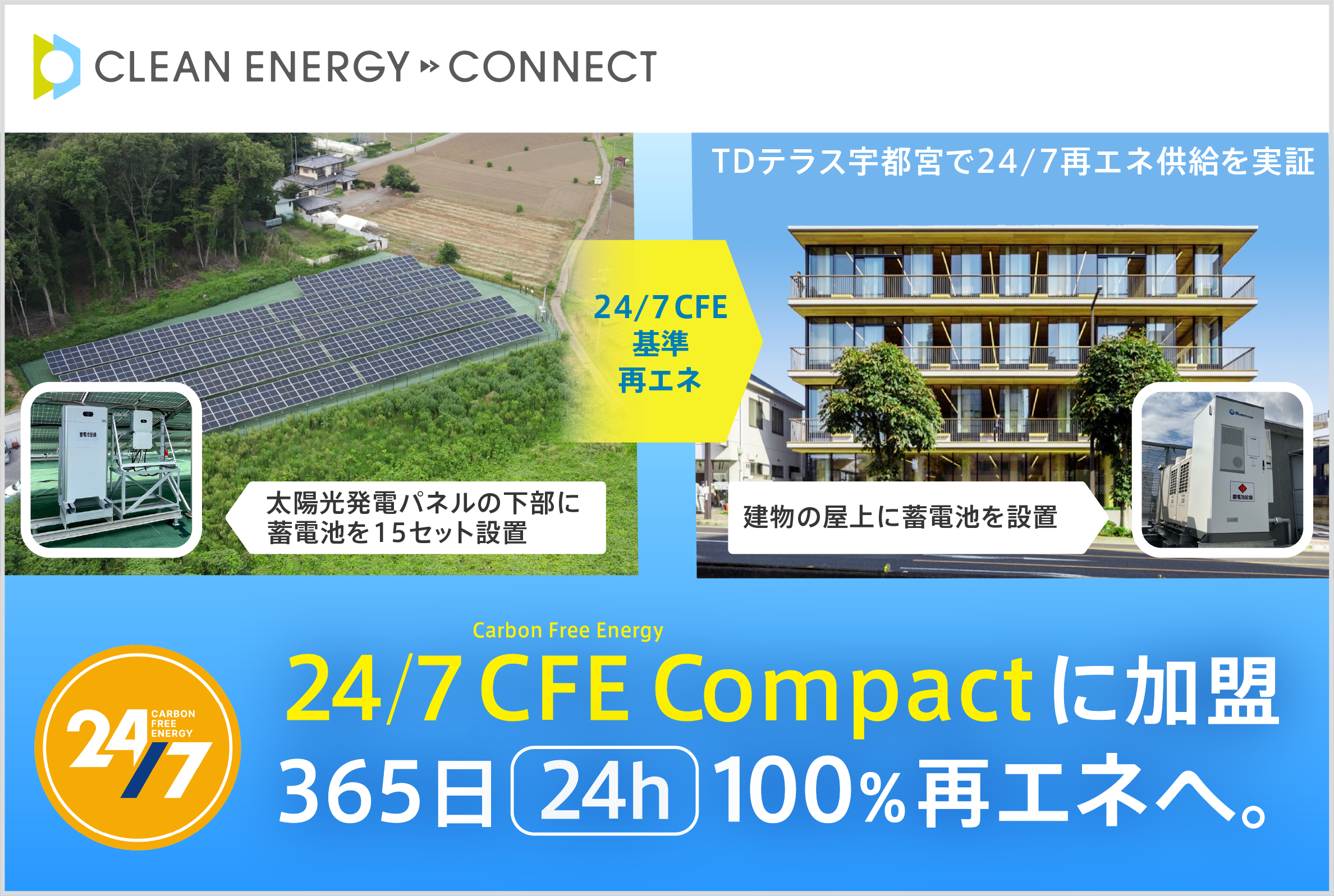 株式会社クリーンエナジーコネクト(代表取締役:内田鉄平、以下「クリーンエナジーコネクト」)は、24/7 CFE(建物における使用電力を24時間365日 100%再生可能エネルギーで賄う取り組み)※ の実現に向けて、国連が主導する国際イニシアチブ 「24/7 Carbon-Free Energy Compact」 に加盟しました。