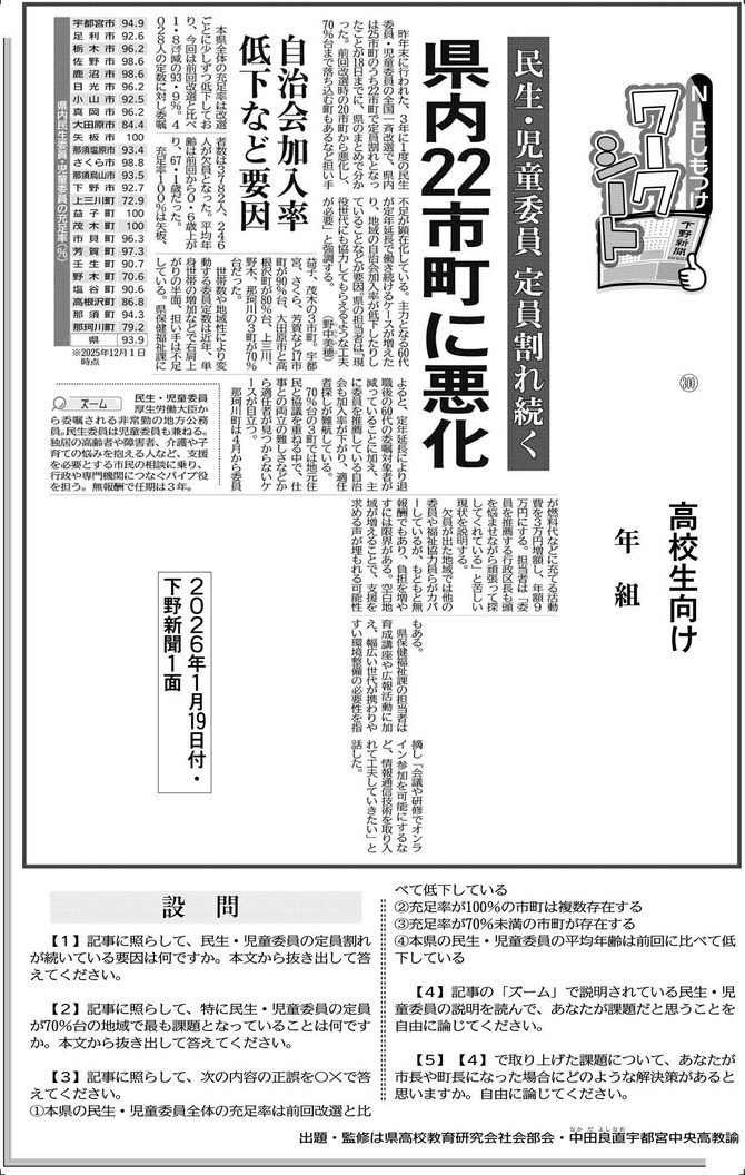 下野新聞の記事を使って社会への関心や読解力を高める「ワークシート」をスタートします。出題するのは、県小・中・高校教育研究会の国語・社会部会に所属する教員たち。ぜひ挑戦してください。