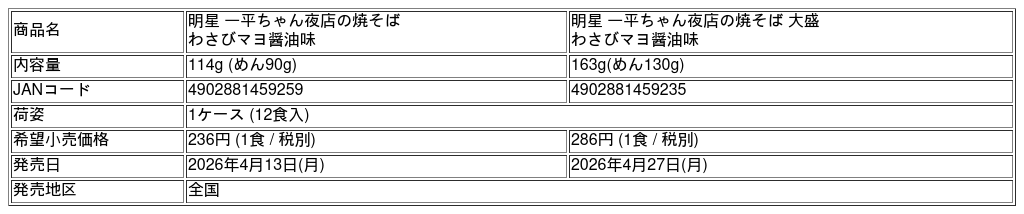 明星食品株式会社 (社長:豊留昭浩) は、カップ焼そば「明星 一平ちゃん夜店の焼そば わさびマヨ醤油味」を2026年4月13日(月)に、「明星 一平ちゃん夜店の焼そば 大盛 わさびマヨ醤油味」を2026年4月27日(月)に全国で新発売します。