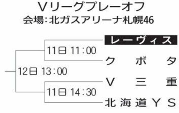 バレーボールVリーグ男子のプレーオフ(PO)は11日、札幌市の北ガスアリーナ札幌46で開幕し、初戦の準決勝でレーヴィス栃木(東地区2位)は午前11時からクボタ(西地区1位)と対戦する。参入2年目でたどり着いた初のPOの舞台。河野裕輔(かわのゆうすけ)監督は「出るだけじゃ面白くない。一番いいところに行けるように、全員で頑張る」と頂点を狙う。